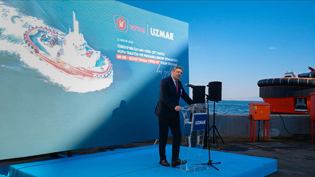In his speech at the ceremony, Mr. Huseyin Akmaz, Regional Director of BOTAS Petroleum Operations, thanked everyone who contributed to the completion of the project and added: "As BOTAS, we are celebrating our 50th anniversary this year. 50 years ago we started our services at the Ceyhan terminal and today we have become an organisation that supplies natural gas to all 81 provinces of our country. In addition to oil and gas, which make up a large part of our services, maritime transport is one of our main activities. As BOTAS, we have reached a considerable size in maritime services with 33 vessels and 500 seafarers. Today, we are harvesting the fruits of the contract we signed with UZMAR in 2022 to expand and strengthen our fleet in a modern way. We are proud and happy to add to our fleet the world's first and our country's first dual- fuel VSP propeller tugs.”